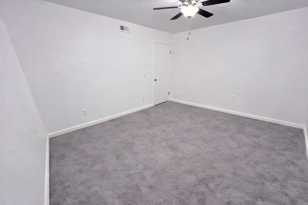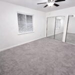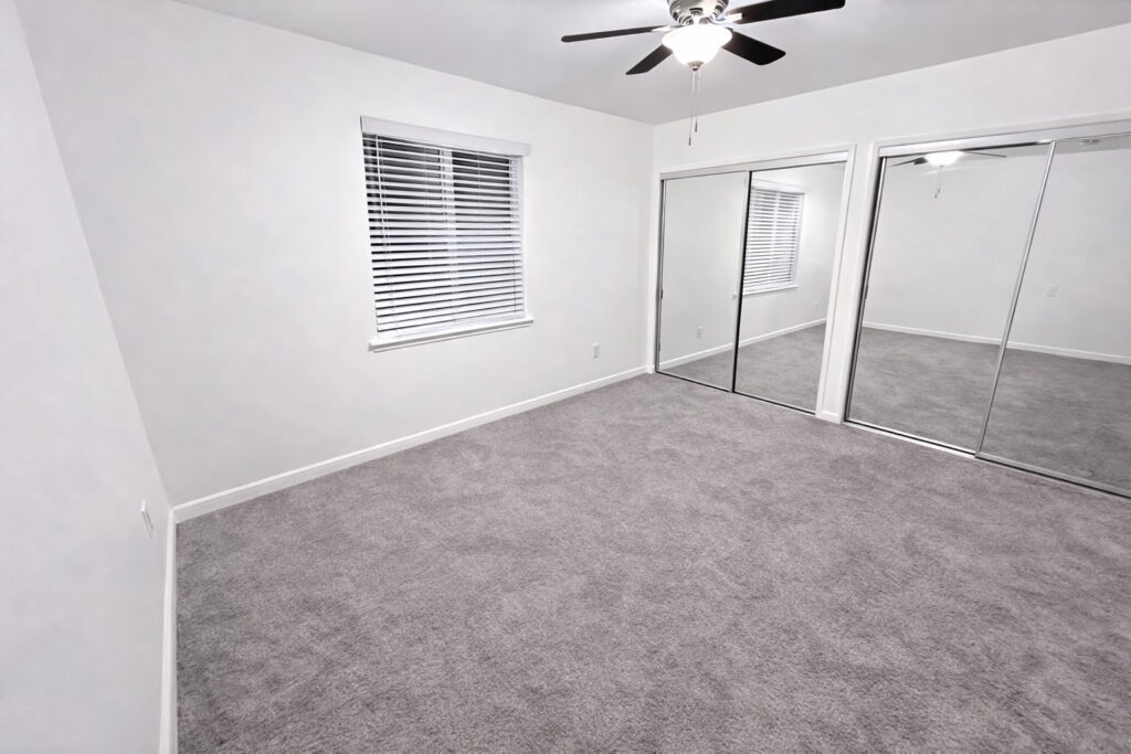 Spacious and clean 14×11 bedroom with large closet, mirrored closet doors, and ceiling fan.